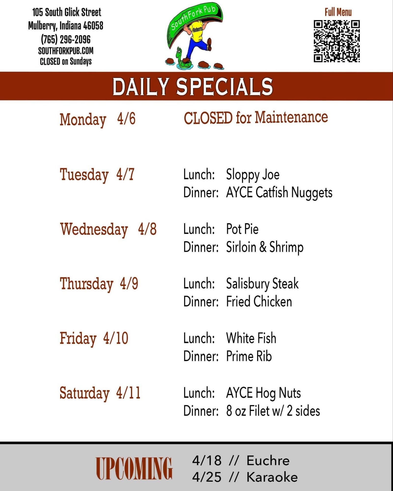 Lunch and Dinner specials 04-06-2026 through 04-11-2026